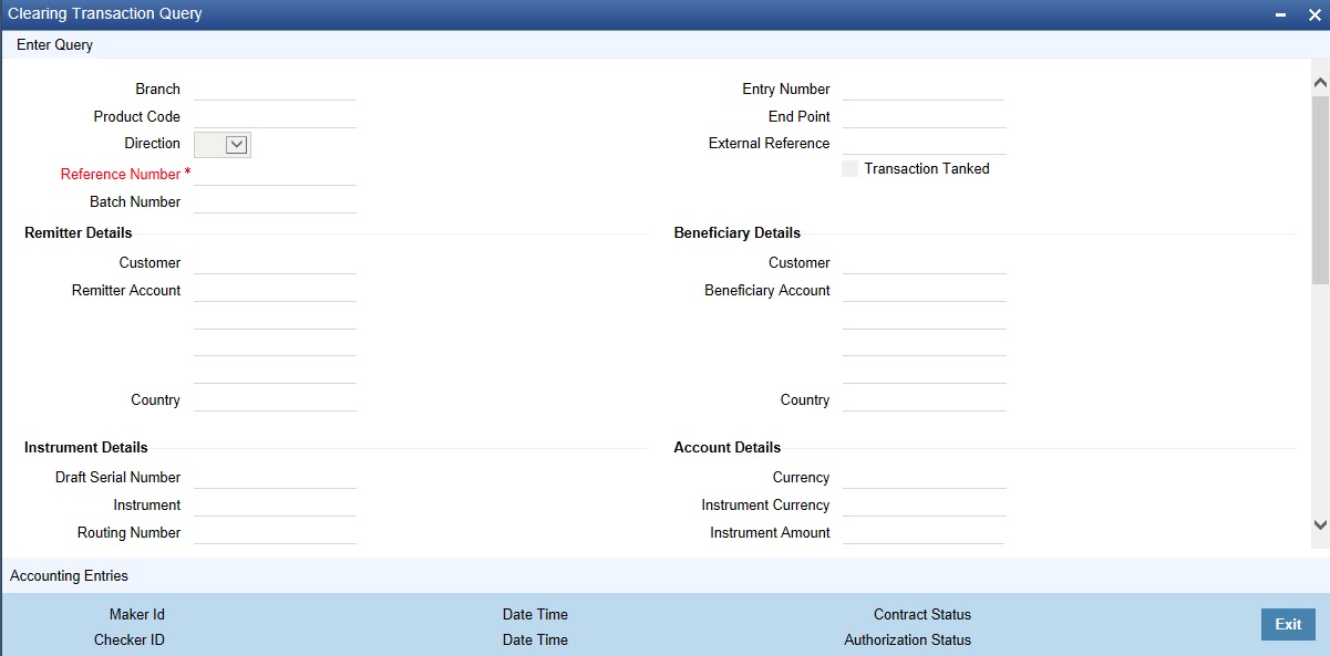 You can view clearing transactions in the ‘Clearing Transaction Query’ screen, where you provide the details of the check instruments as well as the clearing details. You can invoke this screen by typing ‘CGDQUERY’ in the field at the top right corner of the Application tool bar and clicking on the adjoining arrow button.