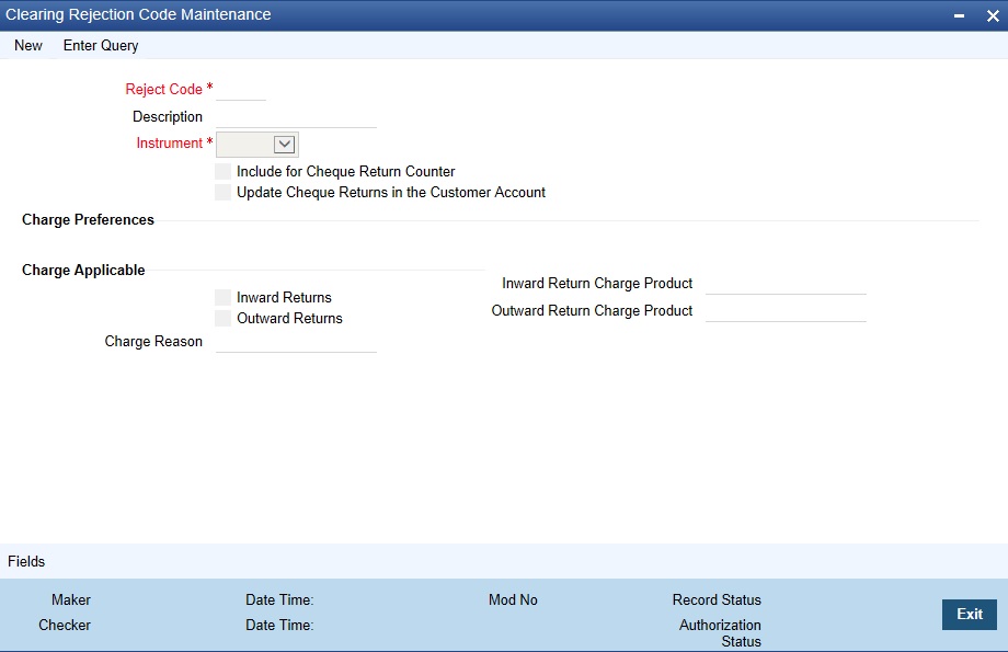 You can levy charges on dishonored cheques based on the reason for rejection. Invoke the ‘Clearing Rejection Reason’ screen from the application browser.