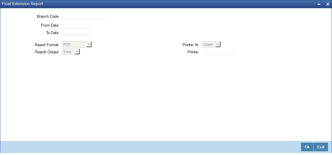 You can invoke ‘Float Extension Report’ screen by typing ‘CGRFLTEX’ in the field at the top right corner of the Application tool bar and clicking on the adjoining arrow button.