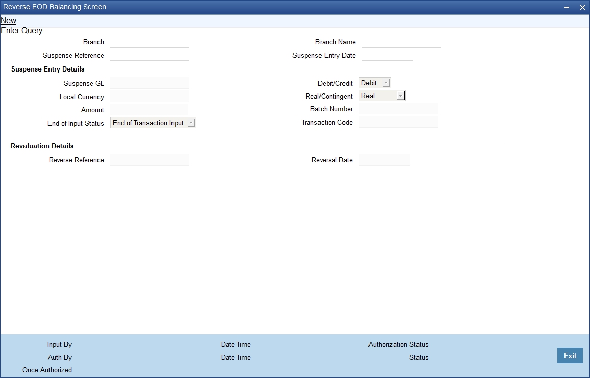 The reversal of the Automatic EOD suspense entry can be done using the ‘Reverse EOD Balancing’ screen.