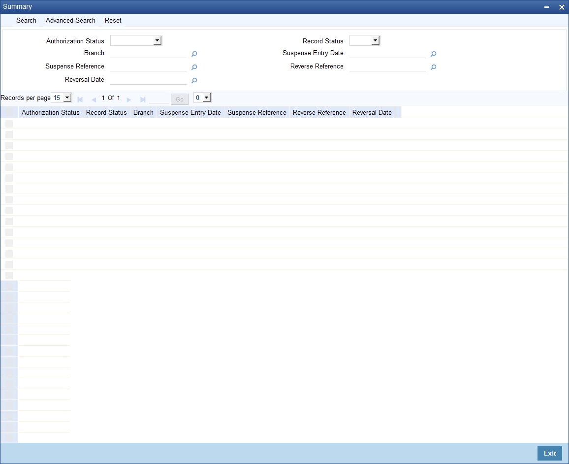 You can get the automatic suspense entry records and do the reversal on the same. You are allowed to perform New, F7 and F8 operations on this screen. You can query record for a particular branch and date and Suspense reference number. The reversal of the entries can be done by using Reverse Button. System posts equivalent negative entries for the amount and currency and generates a unique reversal suspense entry.