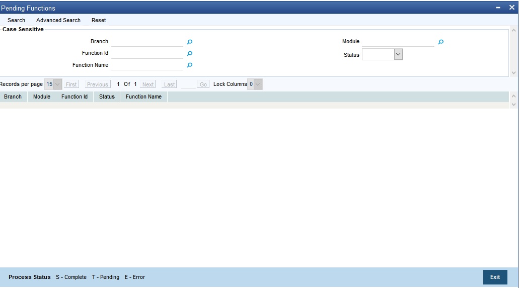 You can view the pending functions of a branch using ‘Pending Functions’ screen. You can invoke the ‘Pending Functions’ screen by typing ‘EISWPPGM’ in the field at the top right corner of the Application tool bar and clicking the adjoining arrow button.