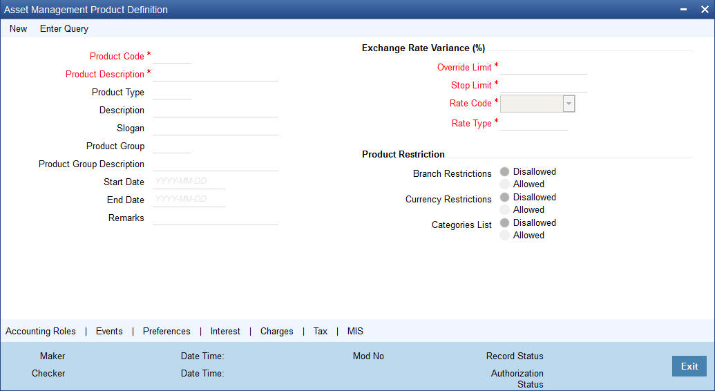 After you enter the details related to a product in ‘Asset Management- Product definition’ screen, the product code and description are defaulted in all sub screens and you cannot edit for screens like branches, customer and so forth.