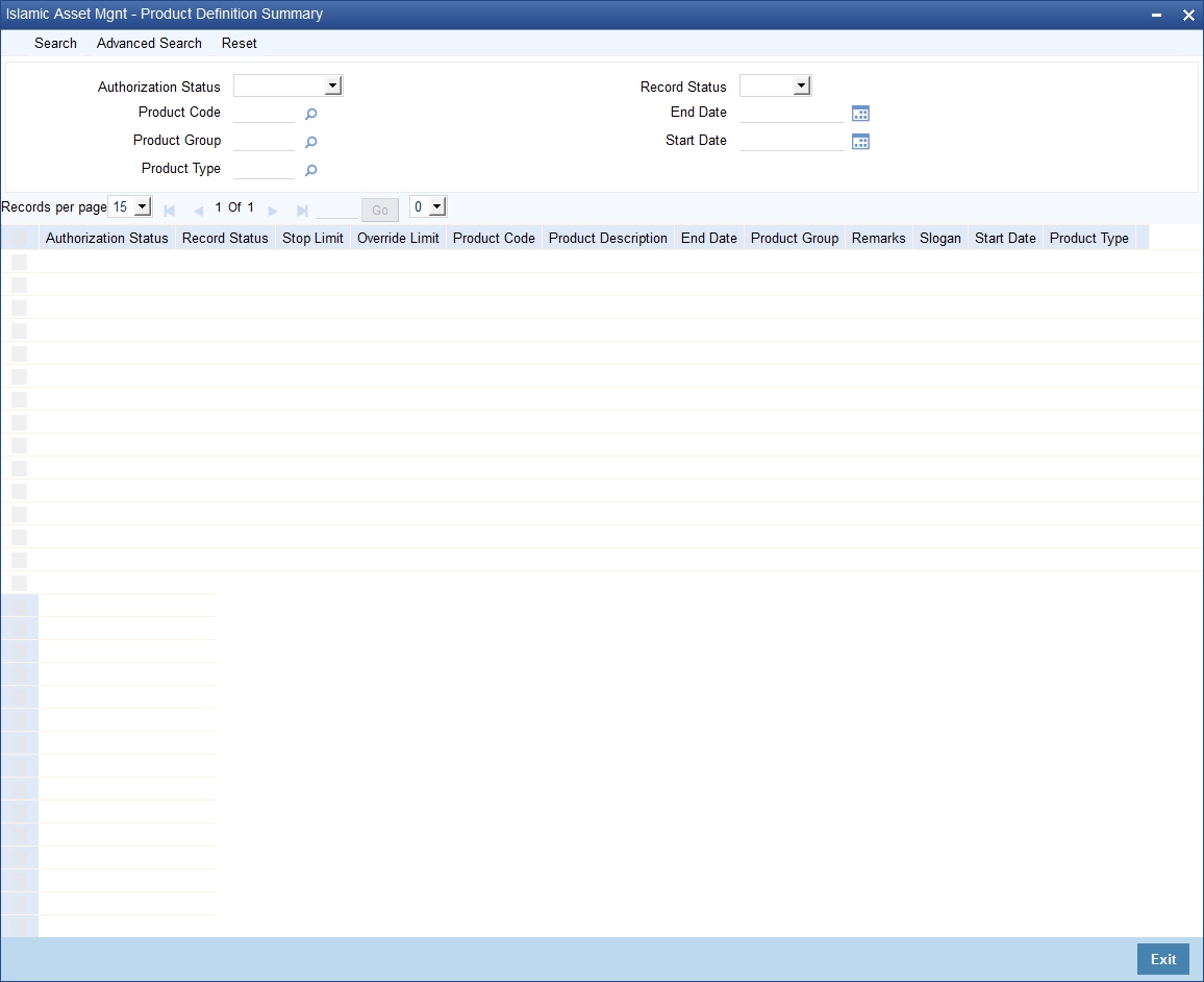 If you are calling a Product Definition record that has already been defined, choose the Summary option. You can invoke this screen by typing ‘AMSFNPRD’ in the field at the top right corner of the Application tool bar and clicking on the adjoining arrow button. From the ‘Summary’ screen double-click a product of your choice to open it.