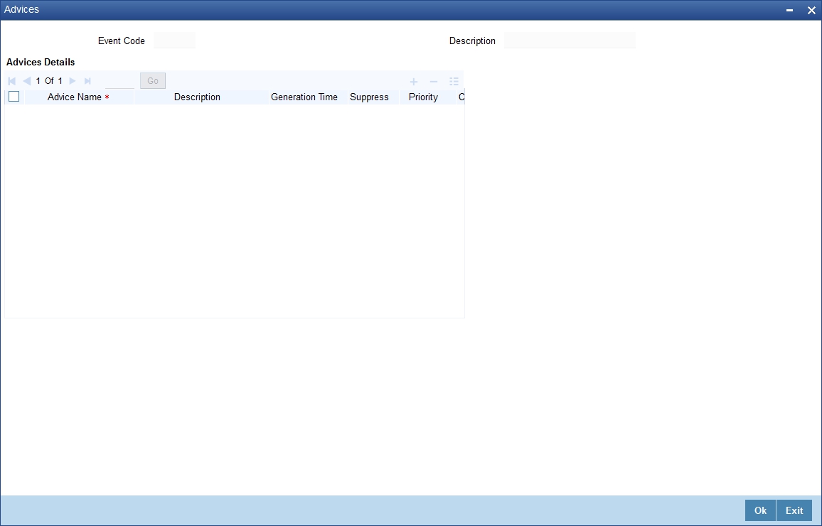 You can select the advices that should be triggered for various events. The selected advices are generated, once the product is authorized. These advices can be simple Debit /Credit advices when any payment or disbursement is made, Deal Slip advices, Rate Revision advices, Loan advices etc.