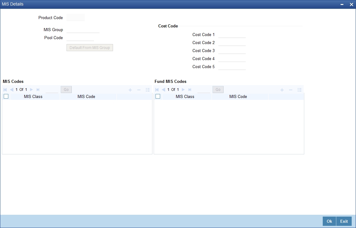 When you click ‘MIS’, the following ‘MIS Details’ screen will be displayed. Specify the values in the fields and click ‘Ok’ button.