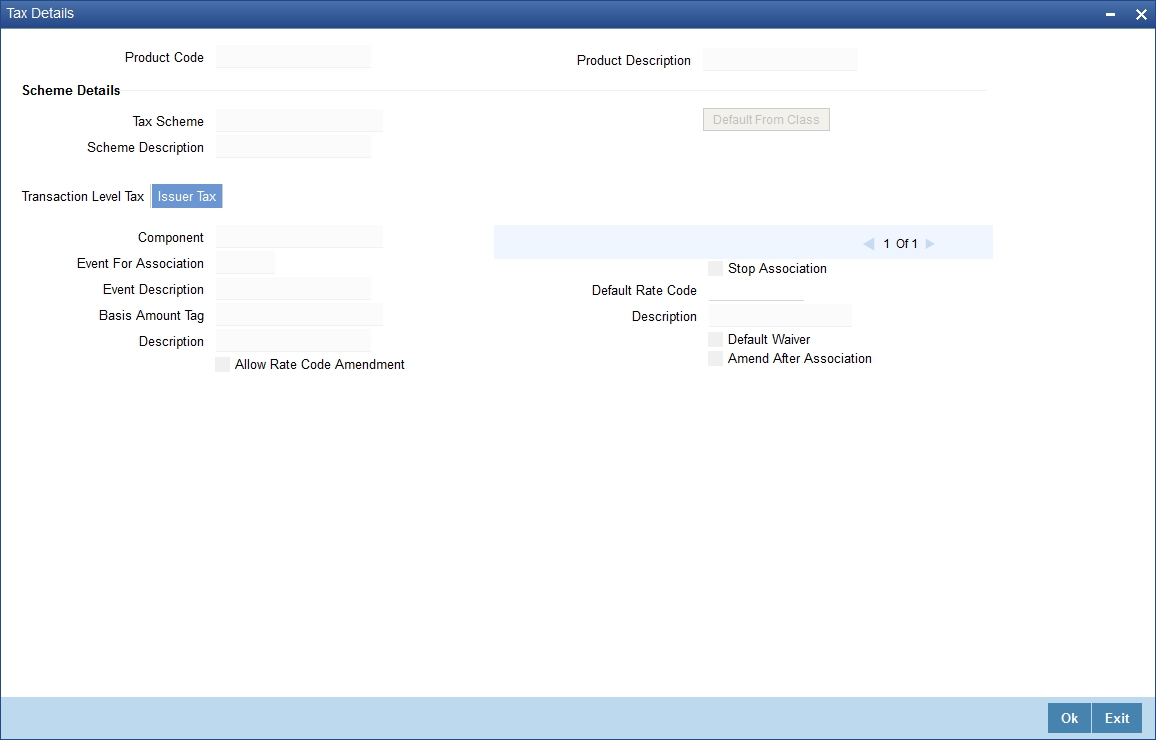 The following ‘Tax Details’ screen will be displayed when you click ‘Tax’. Specify the values in the fields and click ‘Ok’ button.