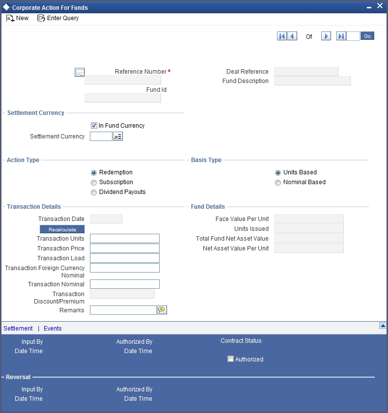 A user bearing a different login ID should authorize a corporate action record that you have entered, before the EOD is run. Once the record is authorized, the ID of the user who authorized it will be displayed in the Auth By field together with the date and time at which it was authorized. The status of the fund is also displayed.