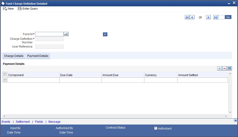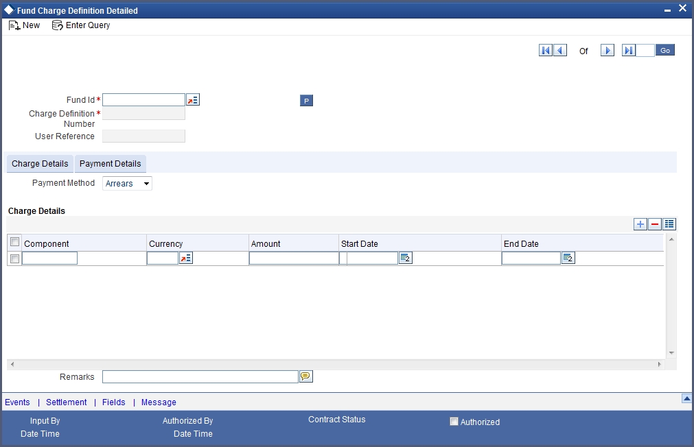 You should first indicate the fund for which you want to specify charge details. Oracle FLEXCUBE automatically assigns a unique identification number to each charge definition record. You can further specify your own identification for the record.
