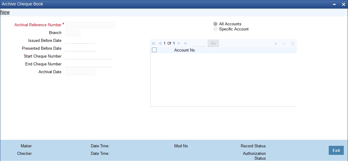 Select ‘Specific Accounts’ to archive cheque books of specific account/accounts. You can specify the specific account numbers under Account Number.