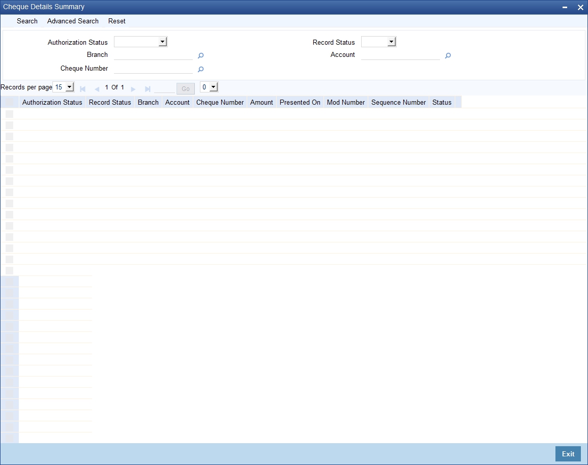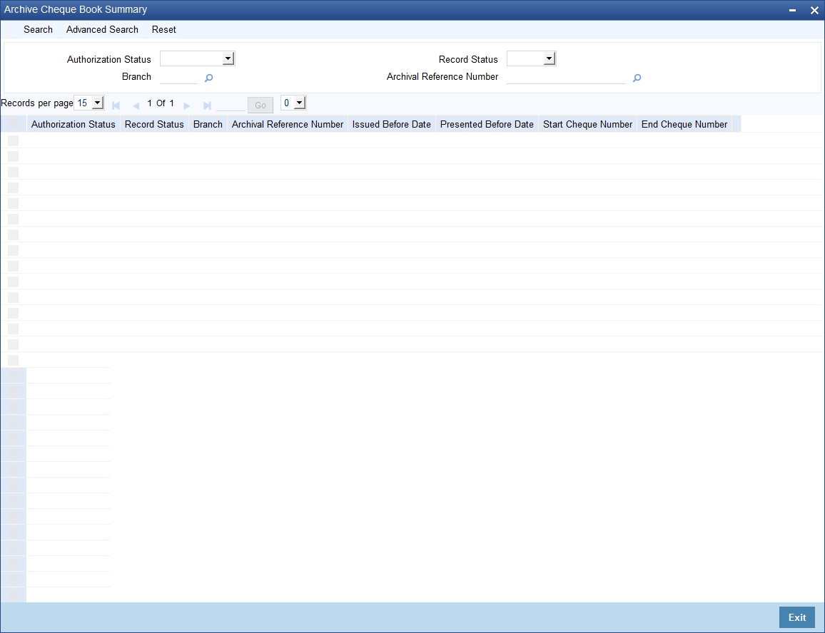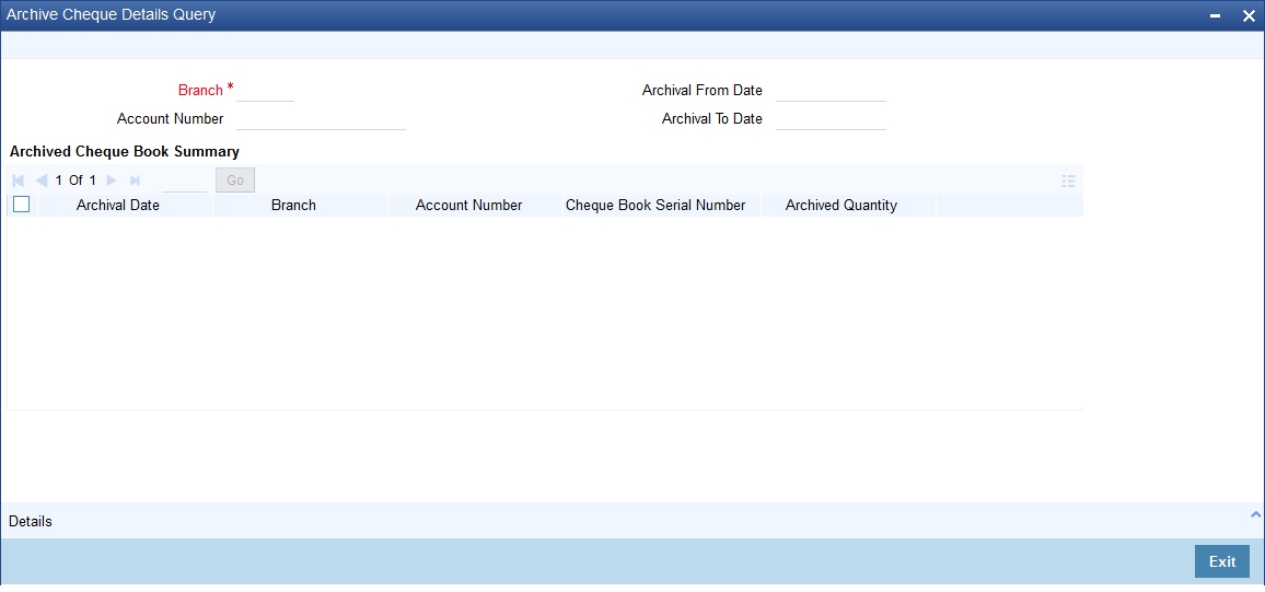 If the cheques are not archived, the system displays the information message as ‘No Cheques are archived for selected criteria’ a authorization level.