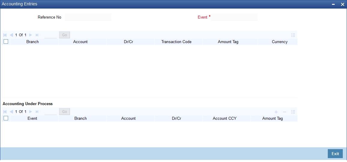 You can view accounting entries in the ‘Events’ screen. Click on ‘Accounting Entries’ button to invoke ‘Accounting Entries’ screen.