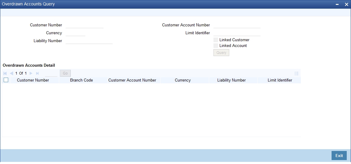 You can query for details of accounts that are overdrawn over limits through the ‘Overdrawn Accounts Query’ screen.