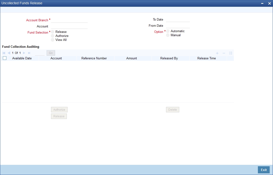 You can invoke the ‘Uncollected Funds Release’ screen by typing ‘ACDUNFDR’ in the field at the top right corner of the Application tool bar and clicking on the adjoining arrow button.