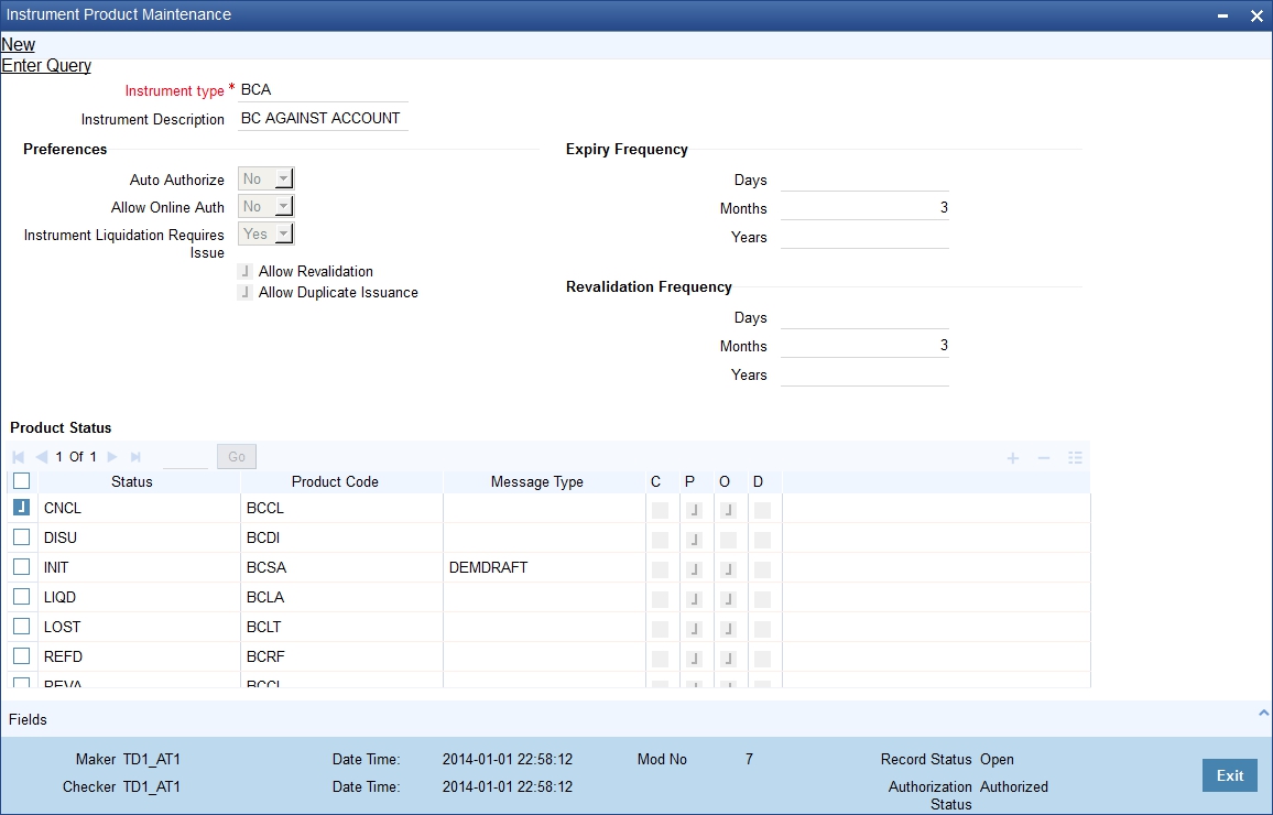 After you maintain the above details for clearing, click ‘Exit’ or ‘Cancel’ button to return back to the Instrument Type Details screen.