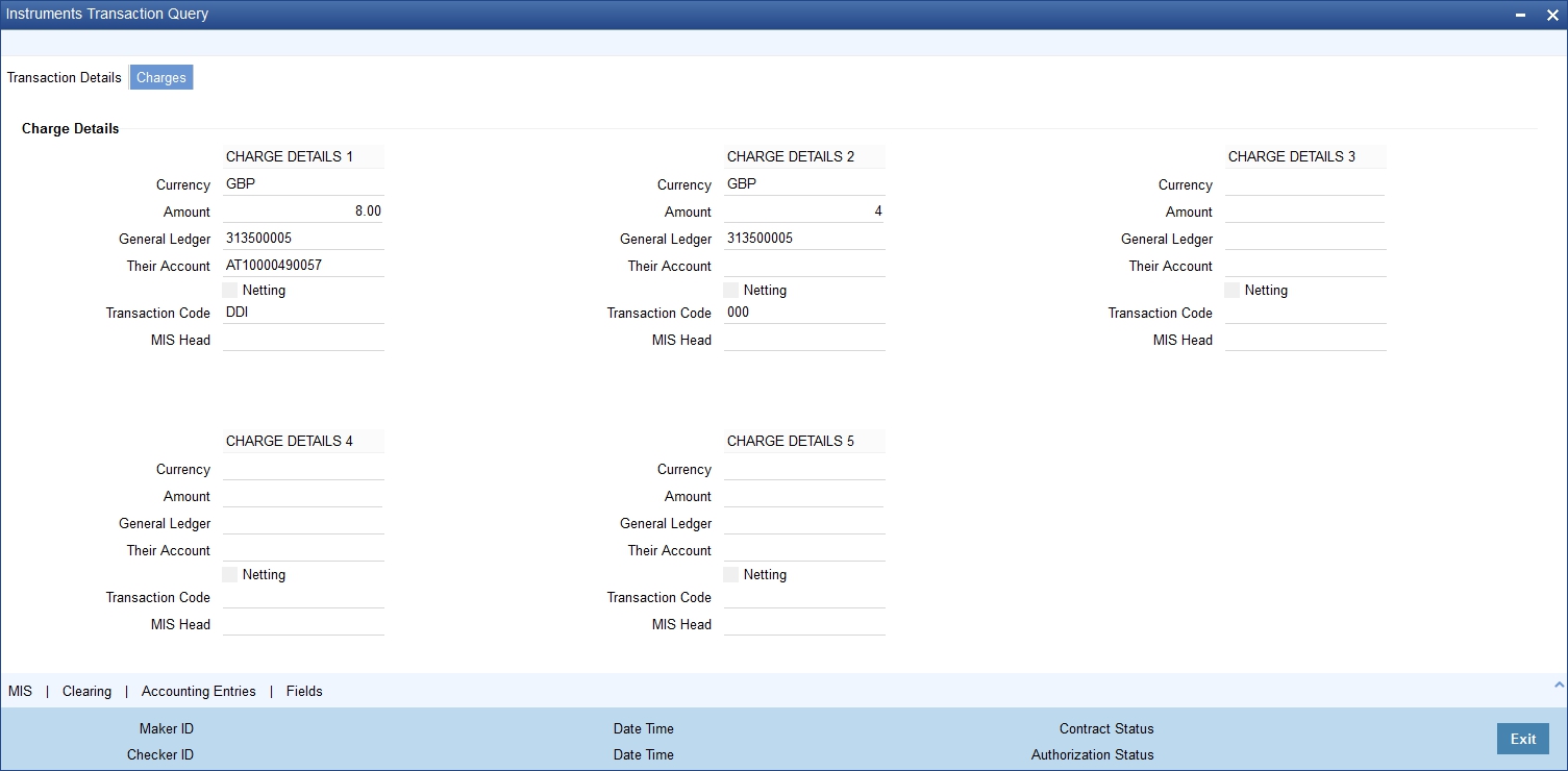 Click on the ‘Charges’ tab in the main ‘Instruments Transaction Query’ screen to view the charges.