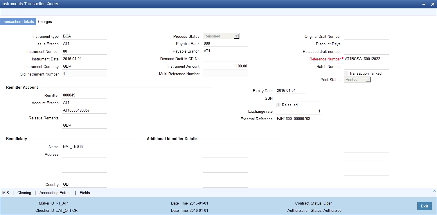 Instrument transactions entered through an Oracle FLEXCUBE branch are stored in the host Oracle FLEXCUBE database through the Instrument details screen.