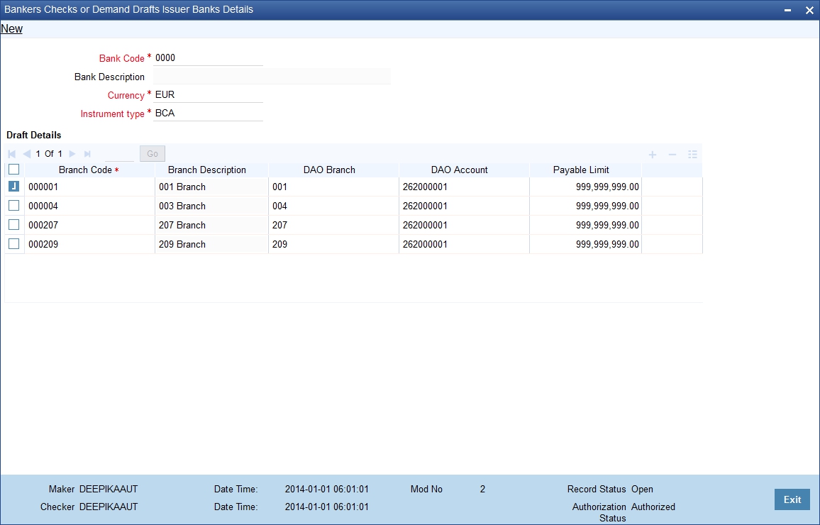 Oracle FLEXCUBE allows you to maintain instruments issued by the bank. As part of the instrument type maintenance, you have to maintain a list of currencies, branches and DAO GL for an instrument type.