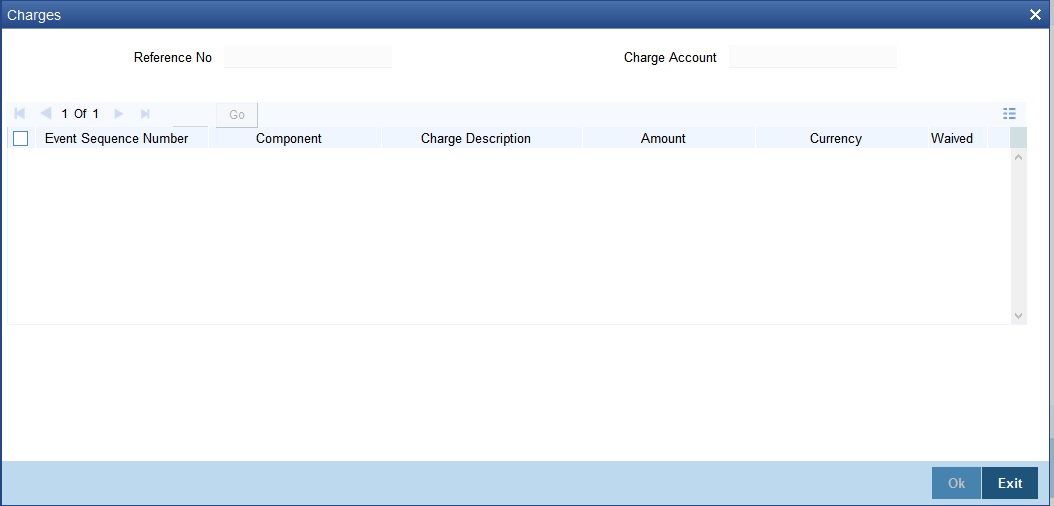 For maintaining charge details in the ‘Charges’ screen., click ‘Charges’ button on ‘Interface Clearing Details’