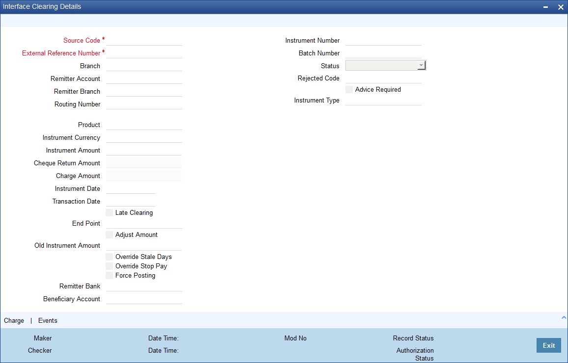 For maintaining charge details in the ‘Charges’ screen, click the ‘Charge’ tab on the ‘Interface Clearing Details screen.’Events tab