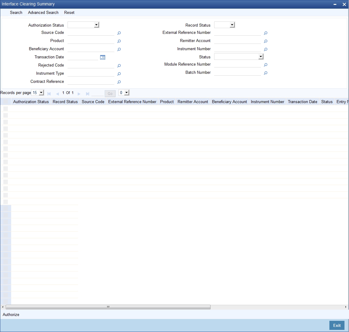 You can view the summary details of the clearing transactions using ‘Interface Clearing Summary’ screen by typing ‘IFSCLGDT’ in the field at the top right corner of the Application tool bar and clicking on the adjoining arrow button.