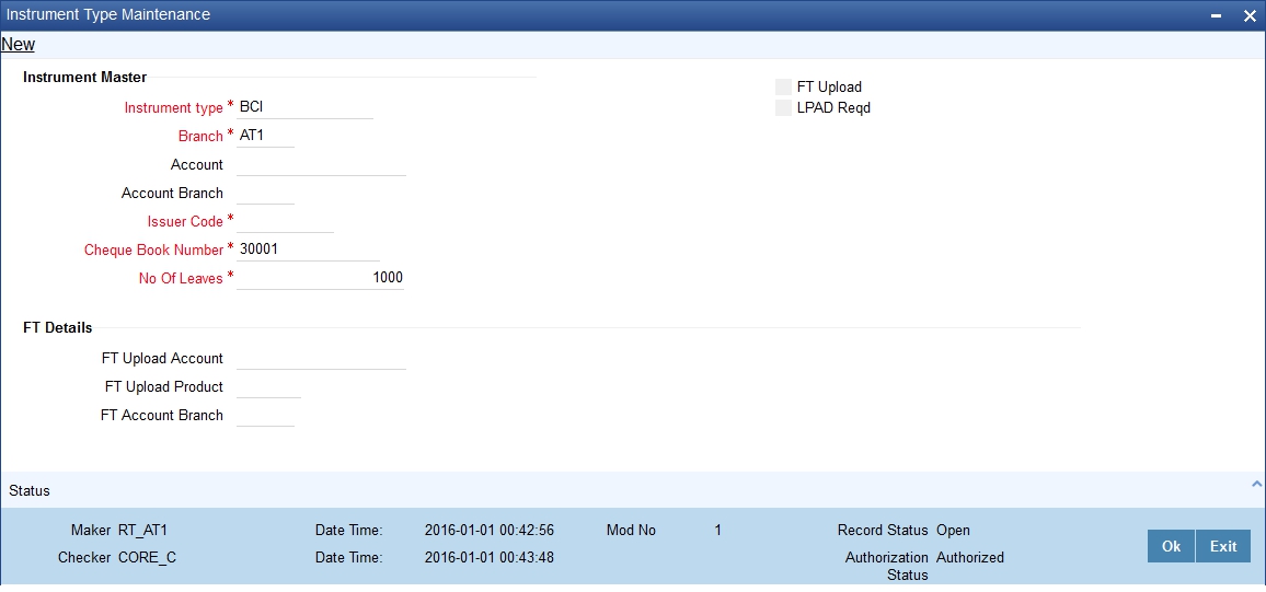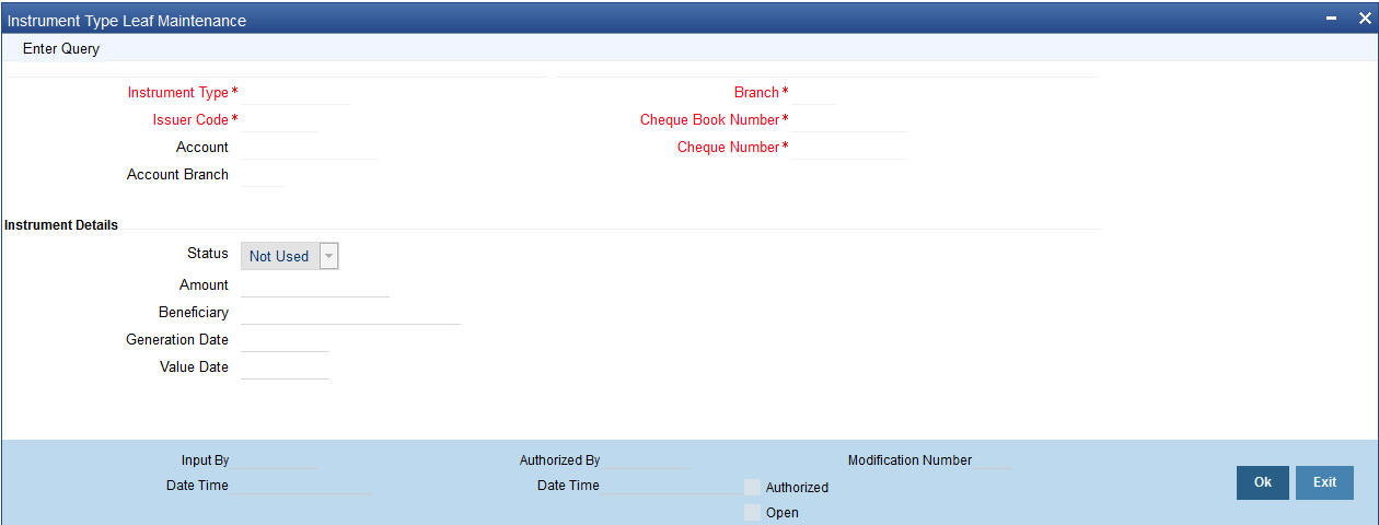 Your bank may issue Cheques to customers from the nostro accounts maintained with other banks. To facilitate this, you need to maintain the details of all the Cheque books issued by those banks/institutions to your bank in Oracle FLEXCUBE. Apart from these your bank would be issuing other instruments such as Drafts, DDs, MCKs and so forth, which also need to be maintained in Oracle FLEXCUBE. Each instrument type is identified by a unique instrument type code, which can be captured in Oracle FLEXCUBE.
