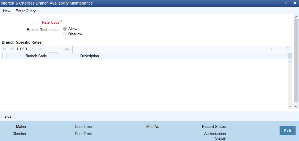 You can maintain rate codes for branches using the ‘Interest & Charges Branch Availability Maintenance’ screen. You can invoke this screen by typing ‘ICDBRSTR’ in the field at the top right corner of the Application tool bar and clicking the adjoining arrow button.