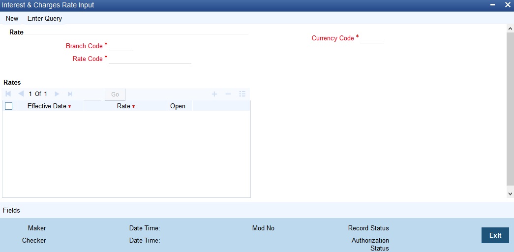For the aforesaid rate code, you need to maintain rates and effective dates in the ‘Interest and Charges Rate Input’ screen. You can invoke the ‘Interest and Charges Rate Input’ screen by typing ‘ICDRATMA’ in the field at the top right corner of the Application tool bar and clicking the adjoining arrow button.