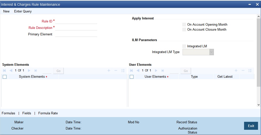 In addition to specifying how the SDEs and UDEs are connected through the formulae, you also define certain other attributes for a rule using the ‘Interest & Charges Rule Maintenance’ screen. You can invoke this screen by typing ‘‘ICDURUMNT’ in the field at the top right corner of the Application tool bar and clicking the adjoining arrow button.