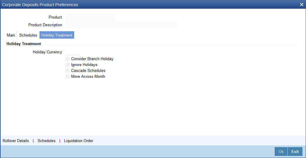 If you do not define any schedules for the product, by default, the deposits involving the product will have bullet (or balloon) schedules. That is, all the components will be liquidated on maturity.