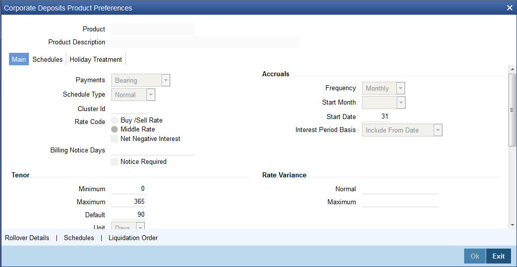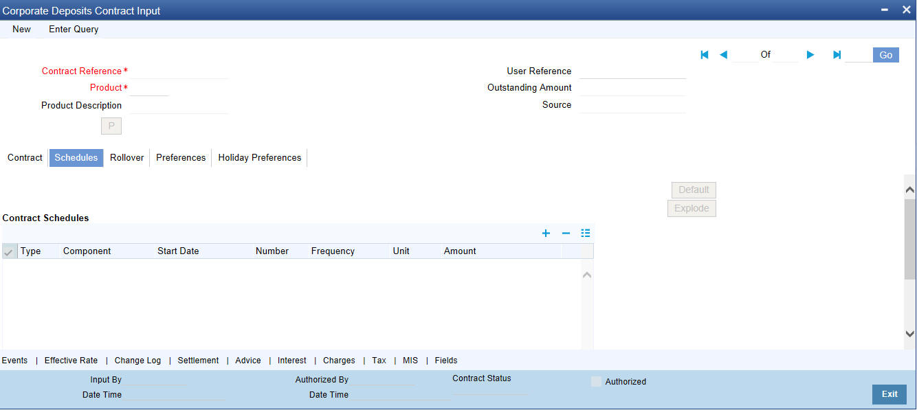 The schedule type that you define for the product will apply to all deposits involving the product. When you process a deposit, the schedule type will be displayed in the Corporate Deposits Contract Input Preferences screen.