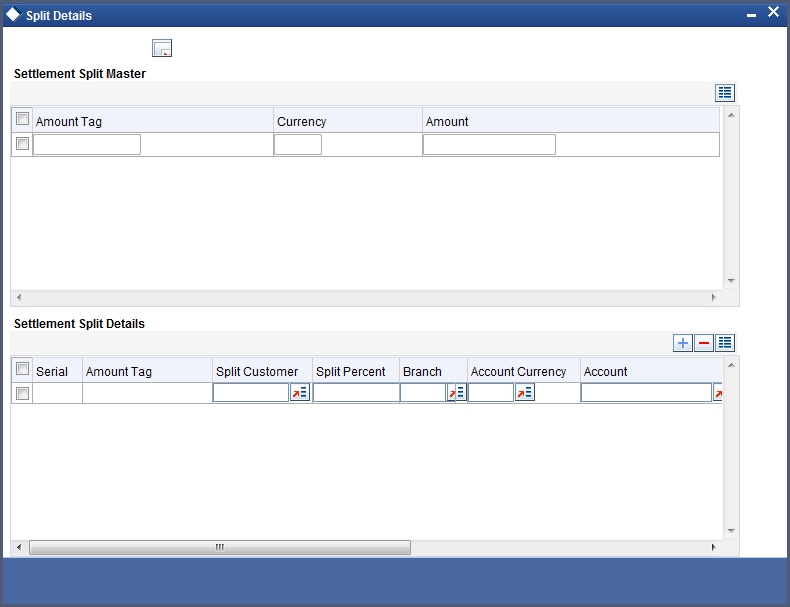 You can specify the split details for each of the amount tags in the Settlement Split Details section of the screen. Click the ‘Add’ button to maintain the split details. The sequence number and the split amount tags are automatically generated by the system. For example, if the Basis amount tag is PRINCIPAL, then the system creates the split amount tag as PRINCIPAL_S01, where S01 is the split sequence number. Each subsequent split amount tag is suffixed by S02, S03 and so on.