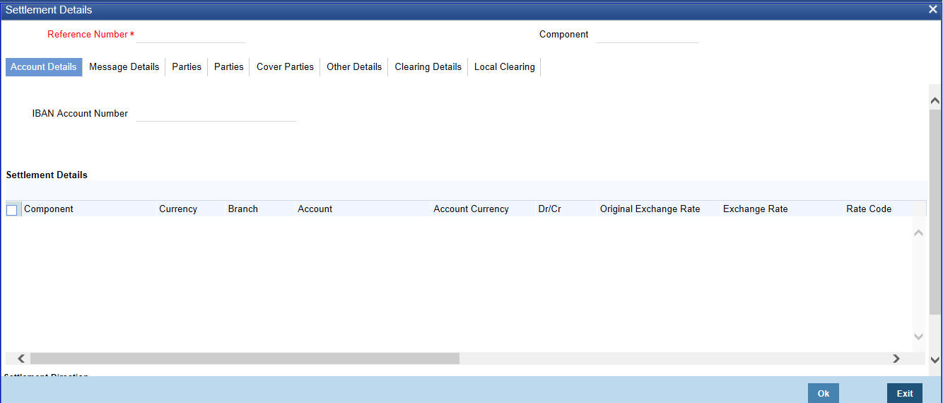 SWIFT messages (MT 100/MT 202) generated towards settlement can furnish the value of the settlement amount in both the settlement account currency, and an ERI currency. If you opt to furnish the ERI value of the amount, you have to enter the following in the Settlement Message Details screen: