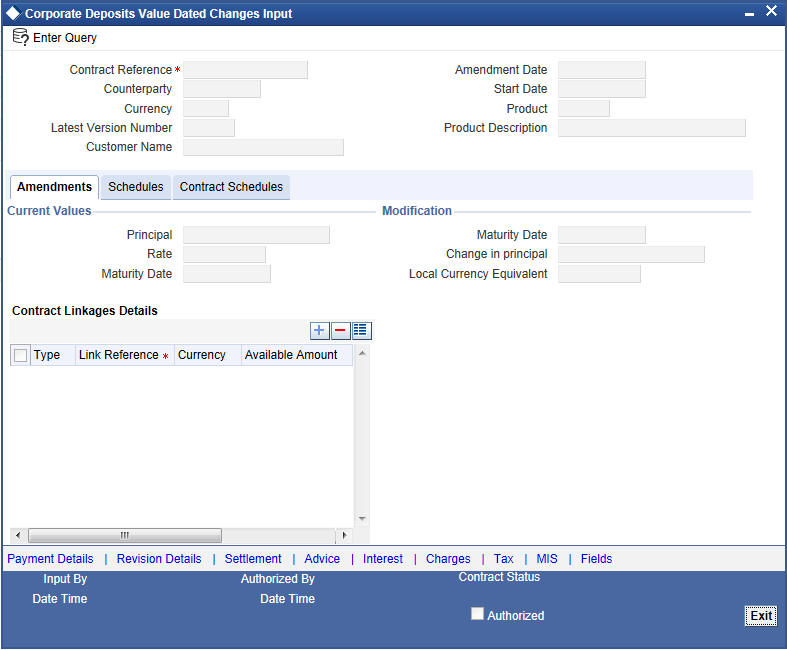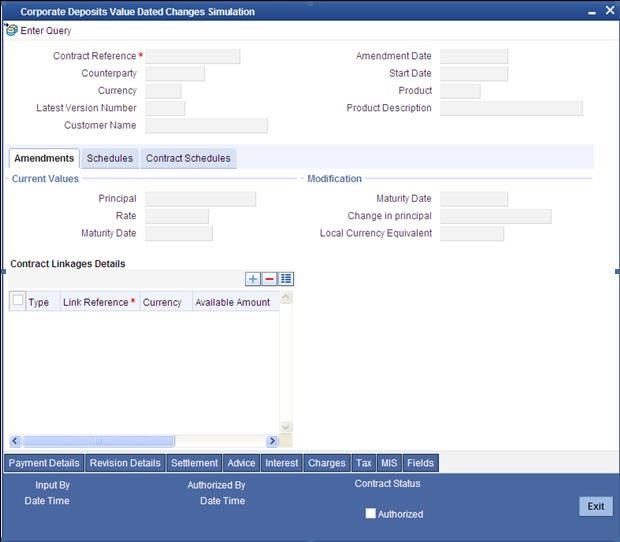 You should ensure that a contract on which you plan to do back dated changes, does not have amortized schedules. Also, a value date in the future cannot be beyond the Maturity Date of the deposit. If it has to be beyond the Maturity Date of the deposit, then you have to first postpone the Maturity Date of the deposit so that your proposed future value date falls within the new maturity date. Only after this change is authorized can you fix a value date in the future for the deposit.The system defaults to today’s date.