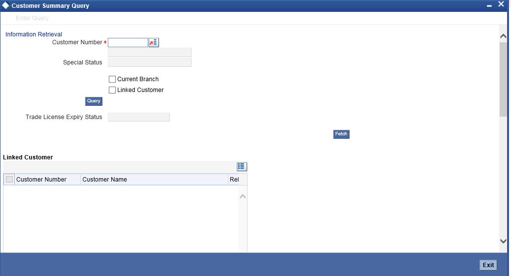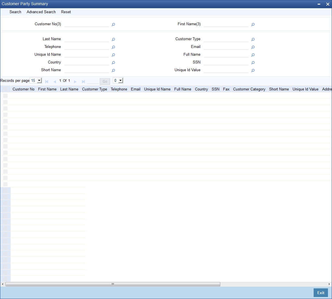 You can search the details of individual or corporate CRM customer or prospect customer in the ‘Customer Party Summer’ screen. To invoke this screen, type ‘STSCUSSH’ in the field at the top right corner of the Application tool bar and clicking the adjoining arrow button.