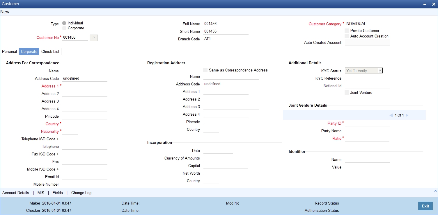 You can invoke the ‘Customer Maintenance’ screen by typing ‘STDCIF’ in the field at the top right corner of the Application tool bar and clicking the adjoining arrow button.