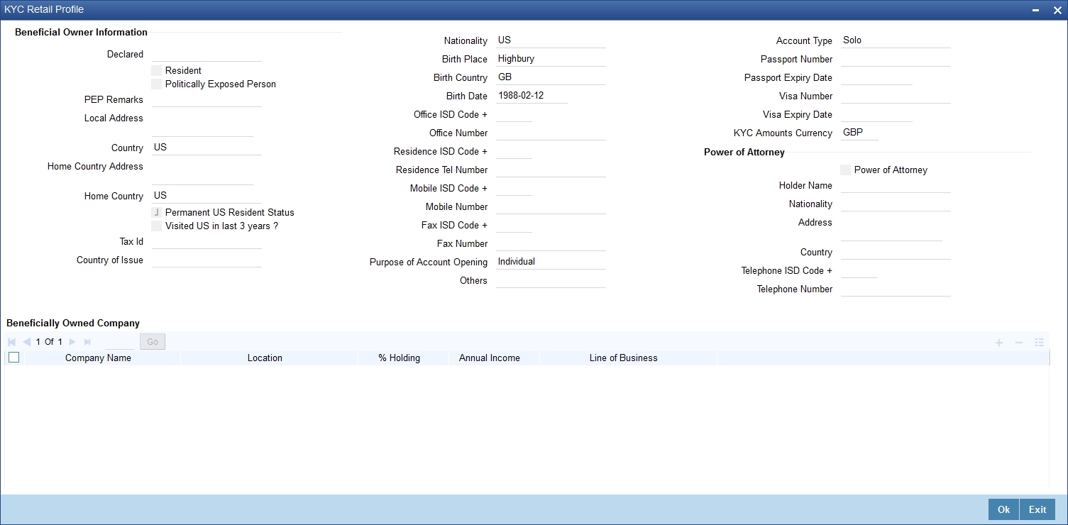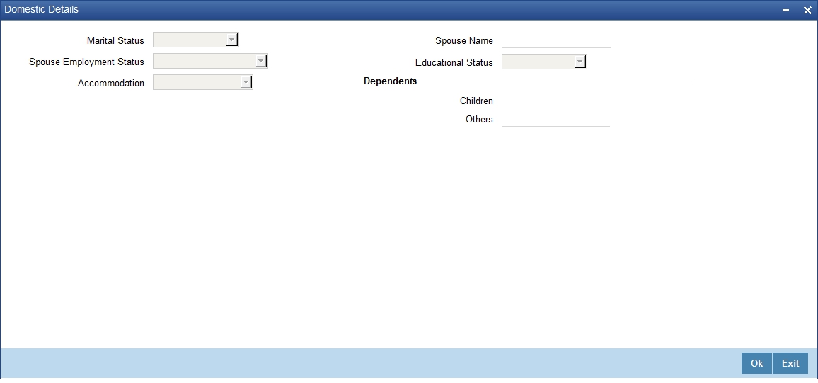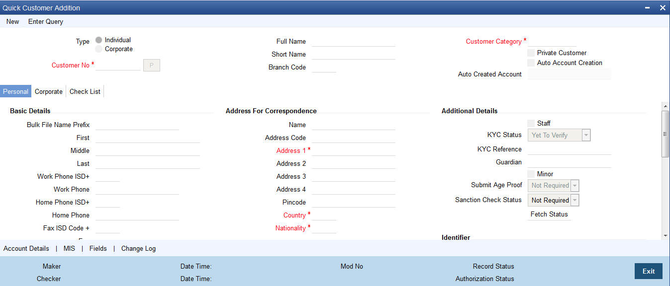 In the ‘Personal’ tab, you can maintain generic personal details of a customer. In addition, you can also maintain the domestic and professional details of the ‘individual’ type customer. You can do this by invoking the relevant screens by clicking on the respective buttons.