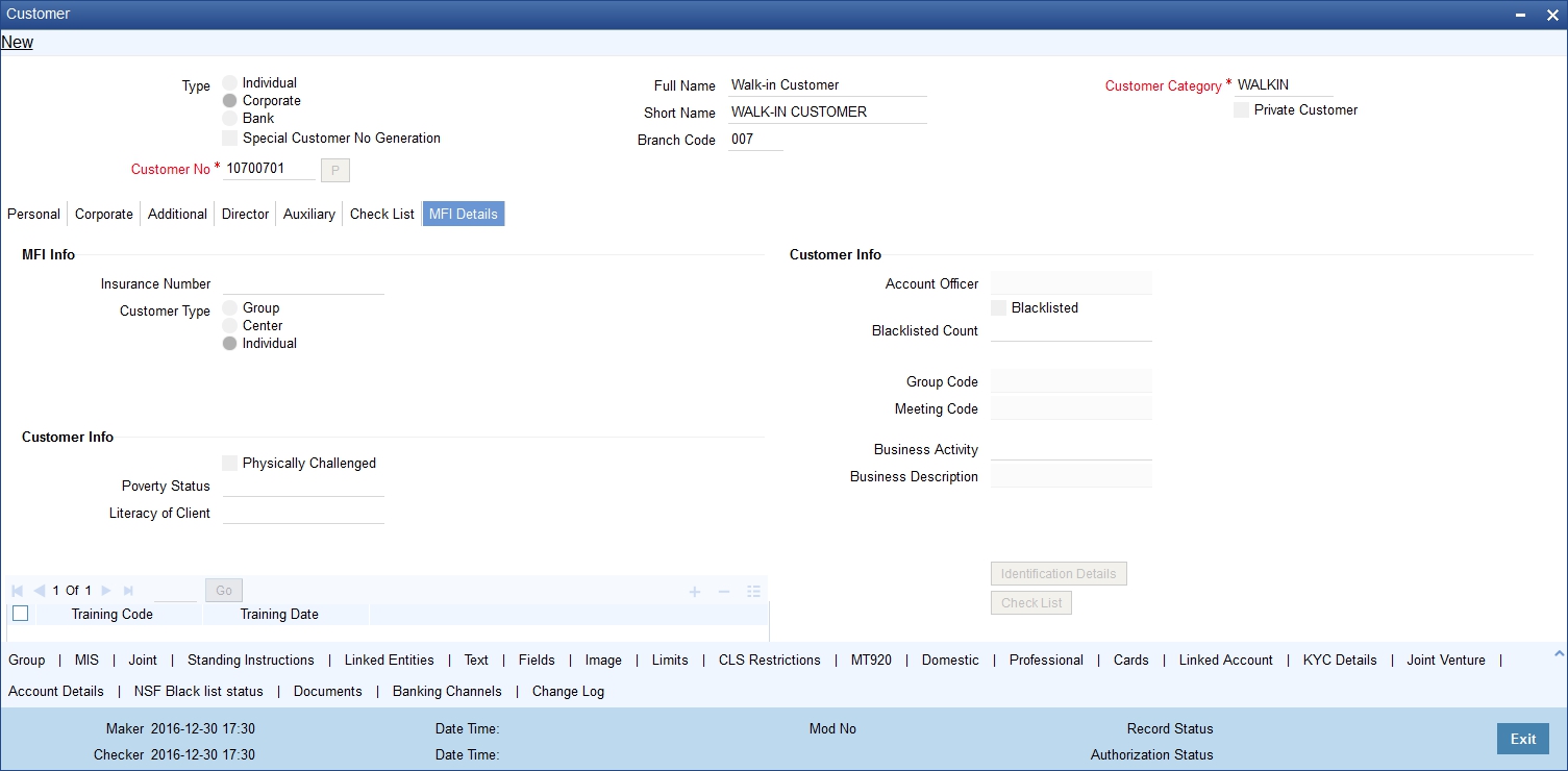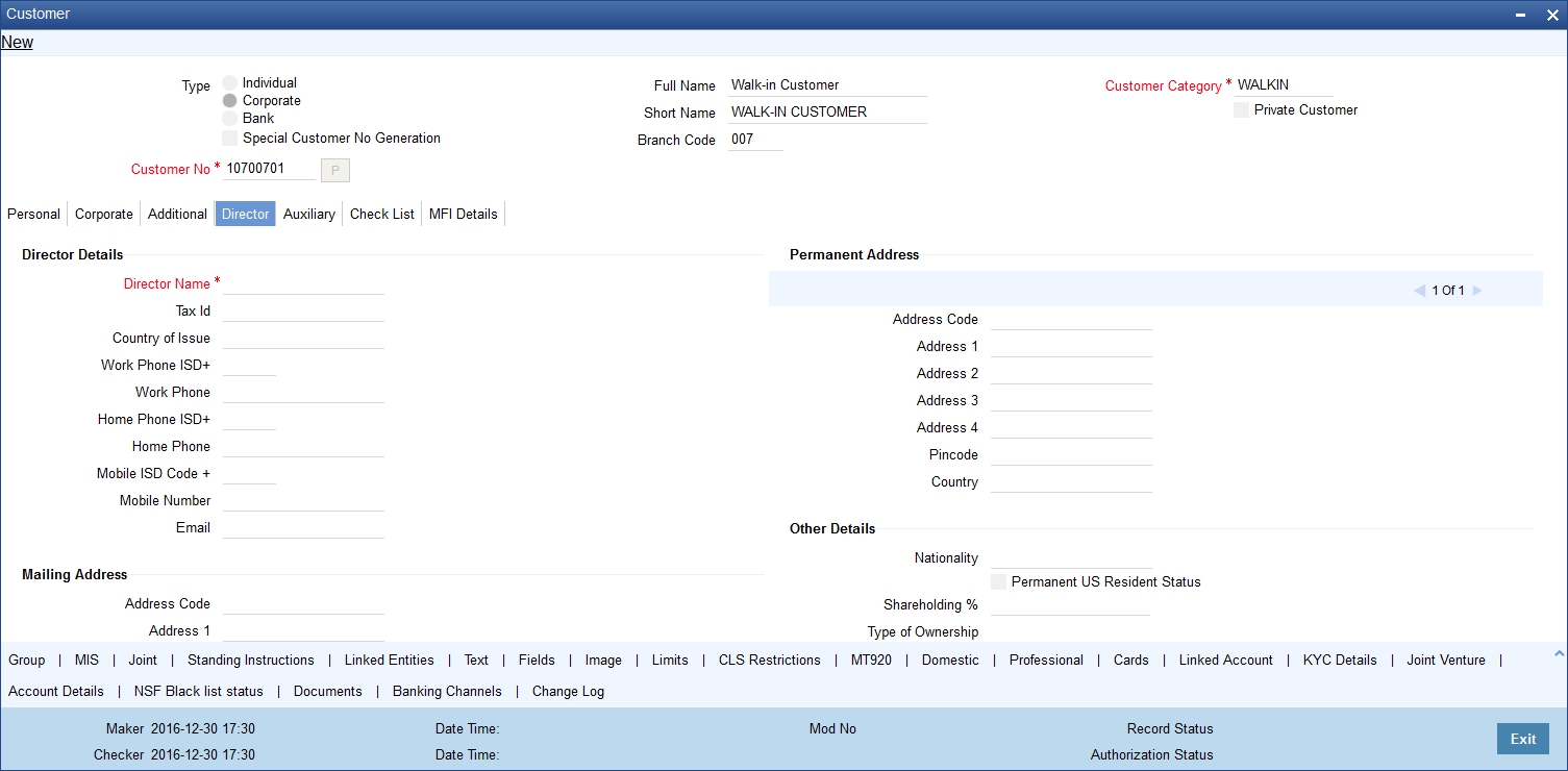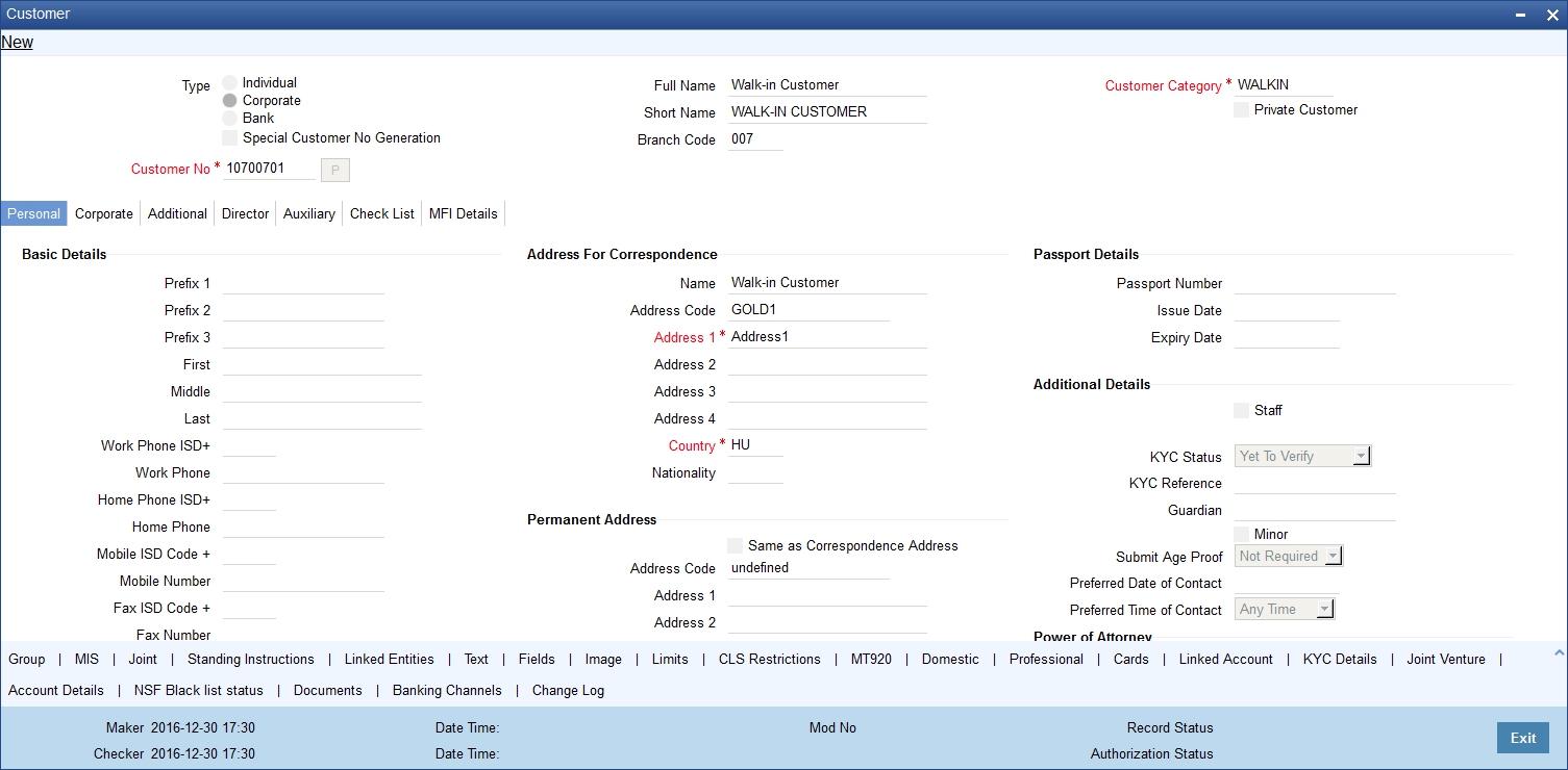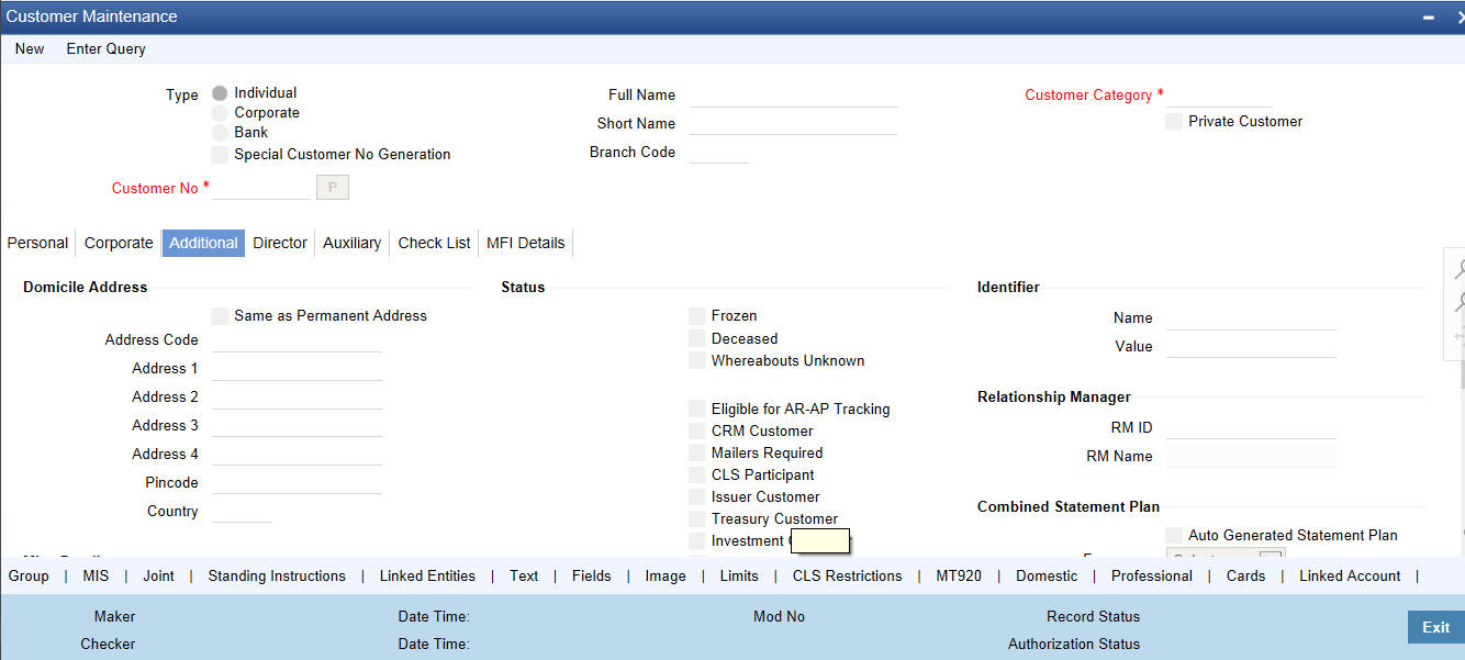In the ‘Customer Maintenance’ screen, you maintain various personal and business details of the customers of your bank.