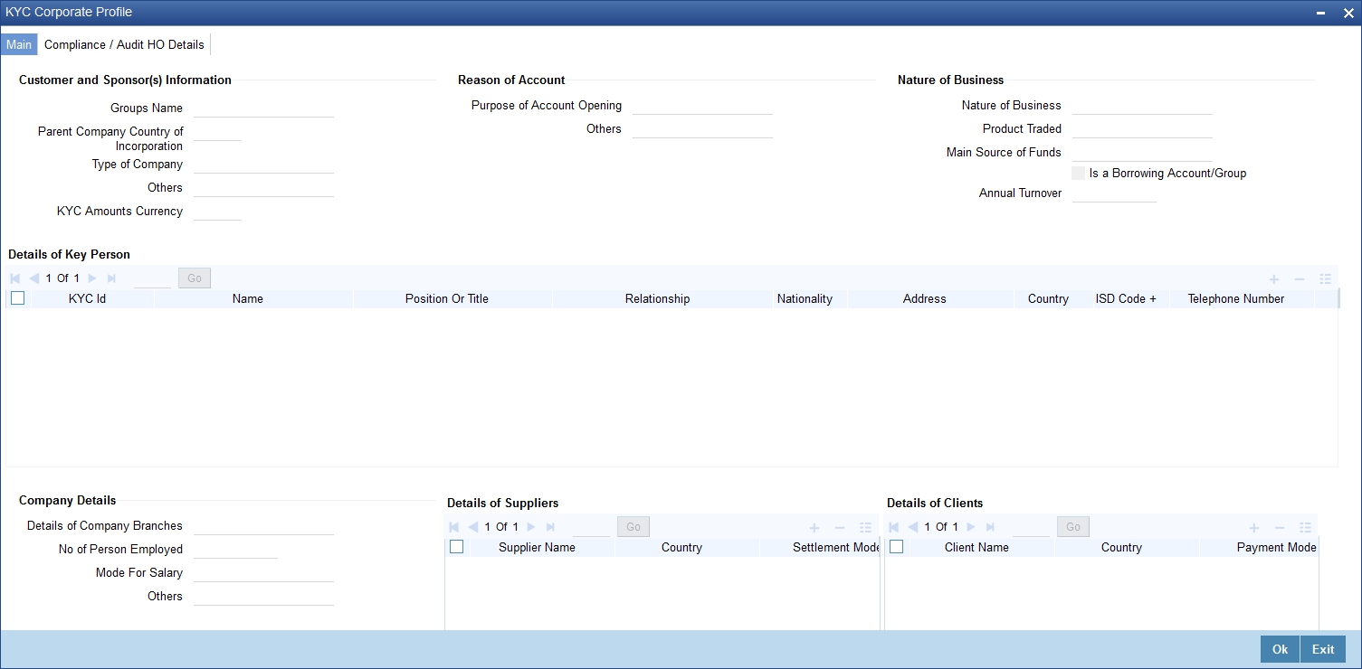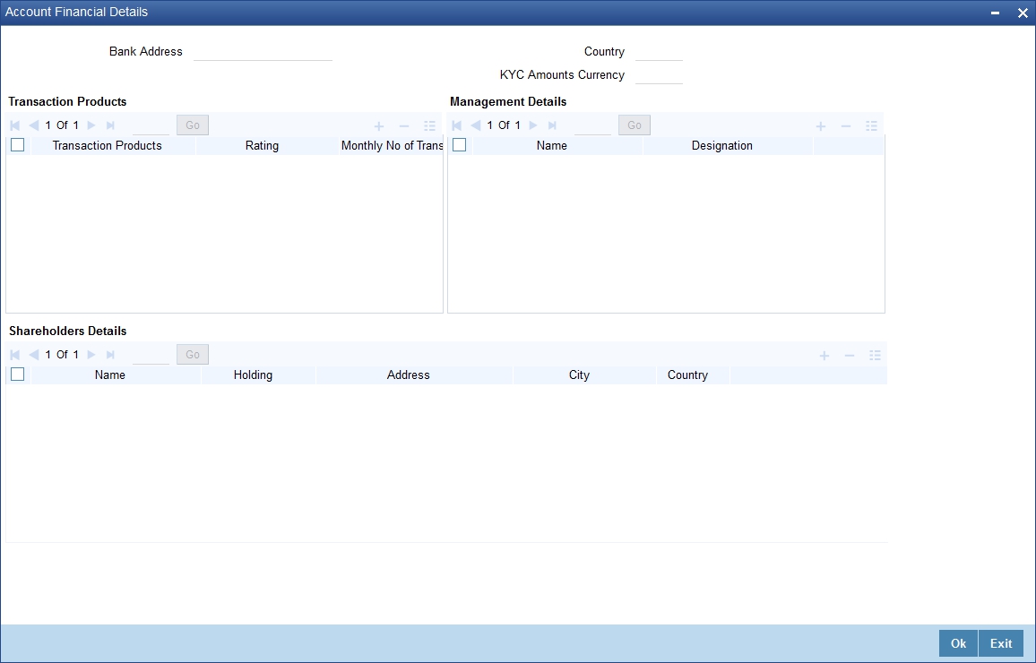 You can specify the KYC details of financial customers using the ‘KYC Financial Profile’ screen. You can invoke this screen by clicking ‘Financial Customer’ button in the ‘KYC Maintenance’ screen.