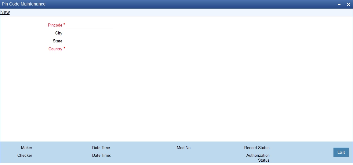 You can invoke the ‘Pin Code Maintenance’ screen by typing ‘STDPINCD’ in the field at the top right corner of the Application tool bar and clicking the adjoining arrow button.