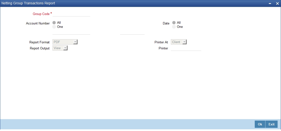 The Netting Group Transaction report provides netting group transaction details. You can invoke the screen by typing 'STRGRNET' in the field at the top right corner of the Application tool bar and click on the adjoining arrow button.