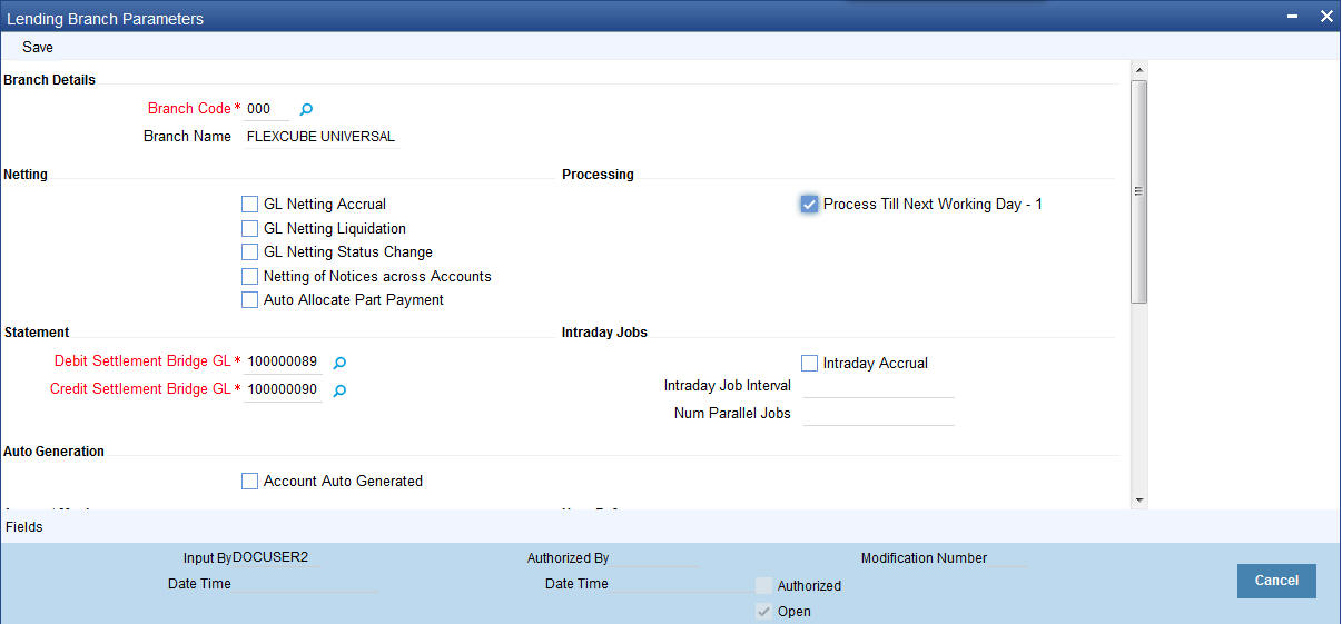 You can maintain the branch parameters in the ‘Retail Lending – Branch Parameters’ screen. You can invoke this screen by typing ‘CLDBRPMT’ in the field at the top right corner of the Application tool bar and clicking the adjoining arrow button.