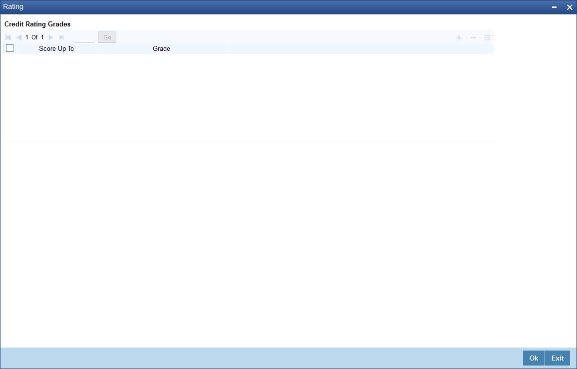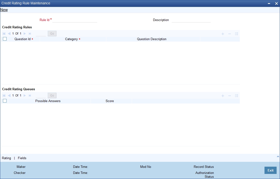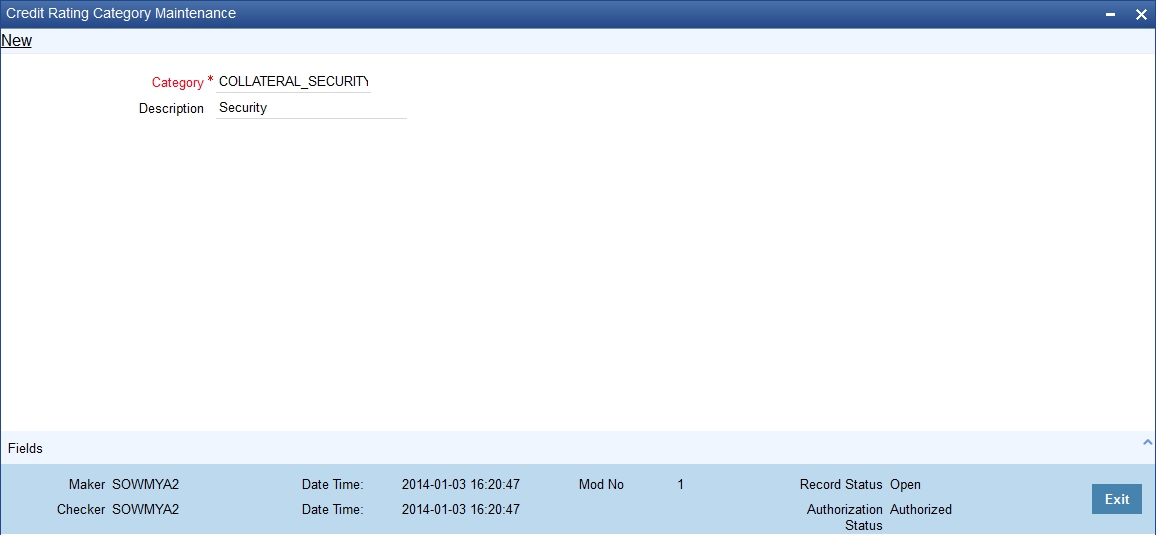 You can create credit rating categories in the ‘Credit Rating Category Maintenance’ screen. You can invoke this screen by typing ‘STDCATMT’ in the field at the top right corner of the Application tool bar and clicking on the adjoining arrow button.