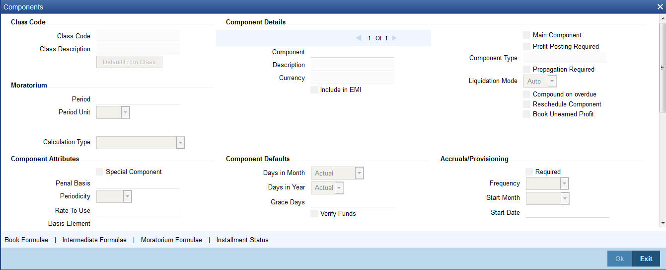 The component ‘PRINCIPAL’ will have default schedule types ‘Disbursement’ and ‘Payment’ and relevant details for these schedules.