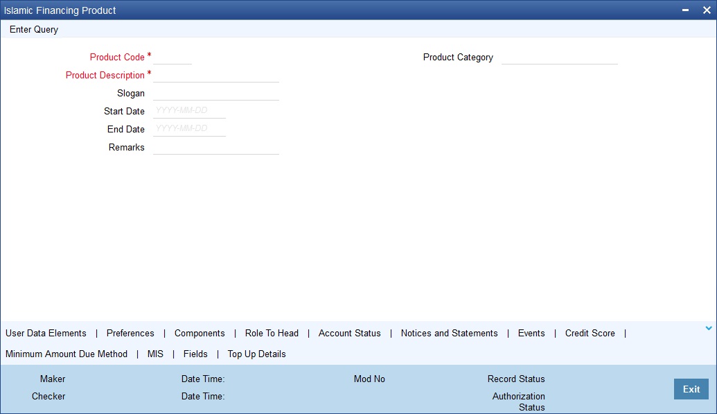 When defining a new product, you should enter a code. This code is unique across the Islamic Financing module of Oracle FLEXCUBE. For instance, if you have used VA01 for a product in this module, you cannot use it as a product code in any other module.