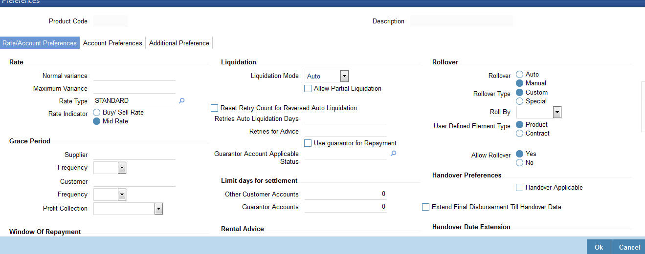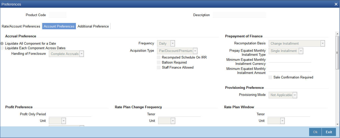 When you click on ‘OK’, the preferences maintained for the default product (the typical characteristics of a finance product) gets associated with the product being defined.