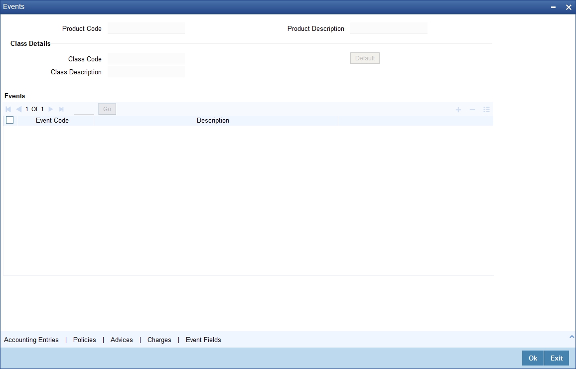 In this screen, you can enter basic information about a product such as the Product Code, the Description, etc. Information related to specific attributes of a product such as accrual details, tenor, account roles and heads, the events etc. have to be defined in the respective sub-screens.