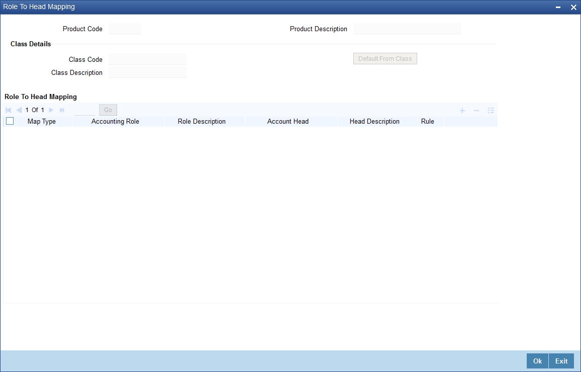 This button is used to specify accounting roles and account heads for the product. (The concept of accounting roles and heads is explained later). |
