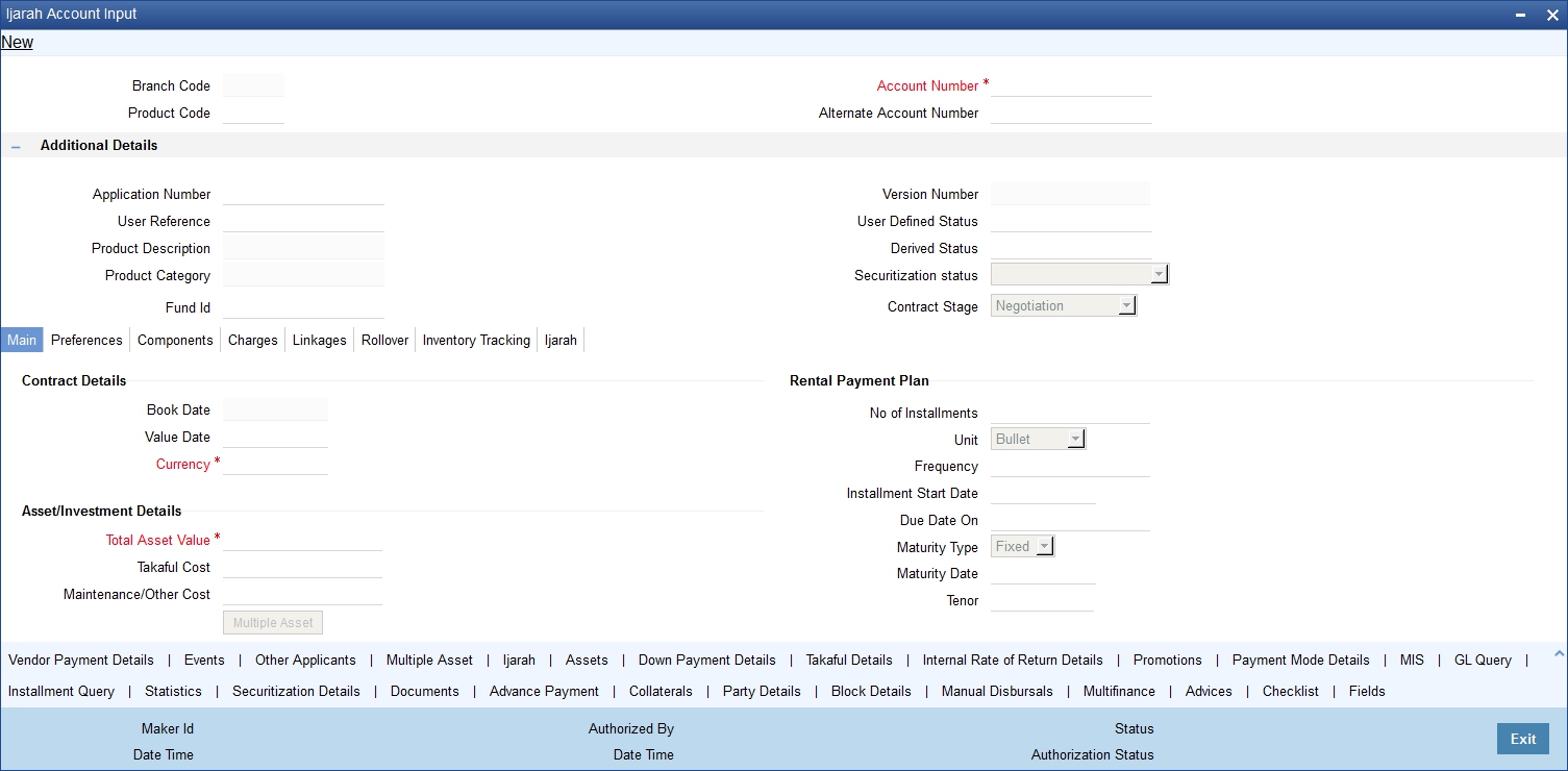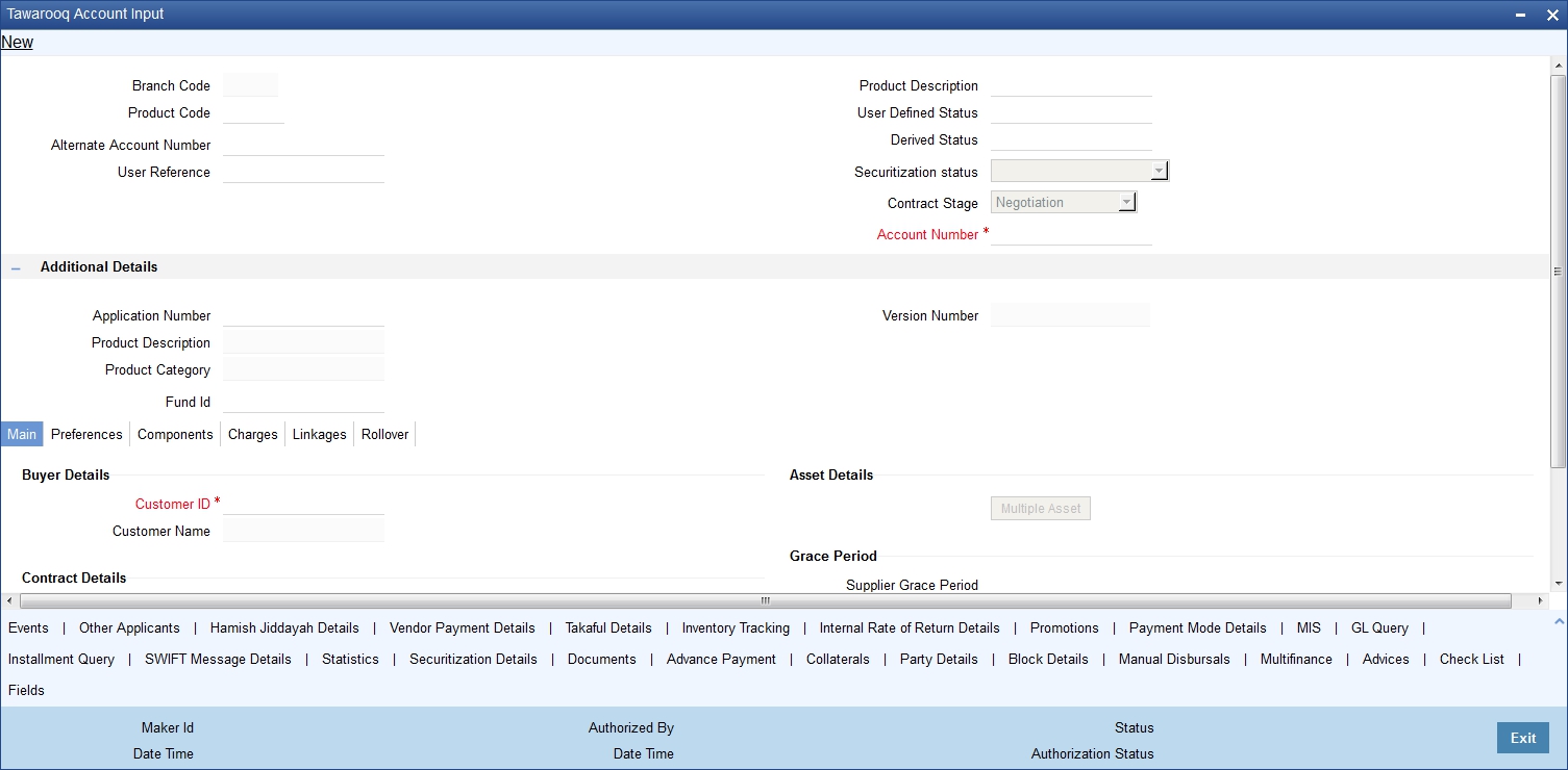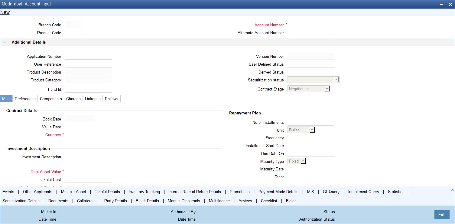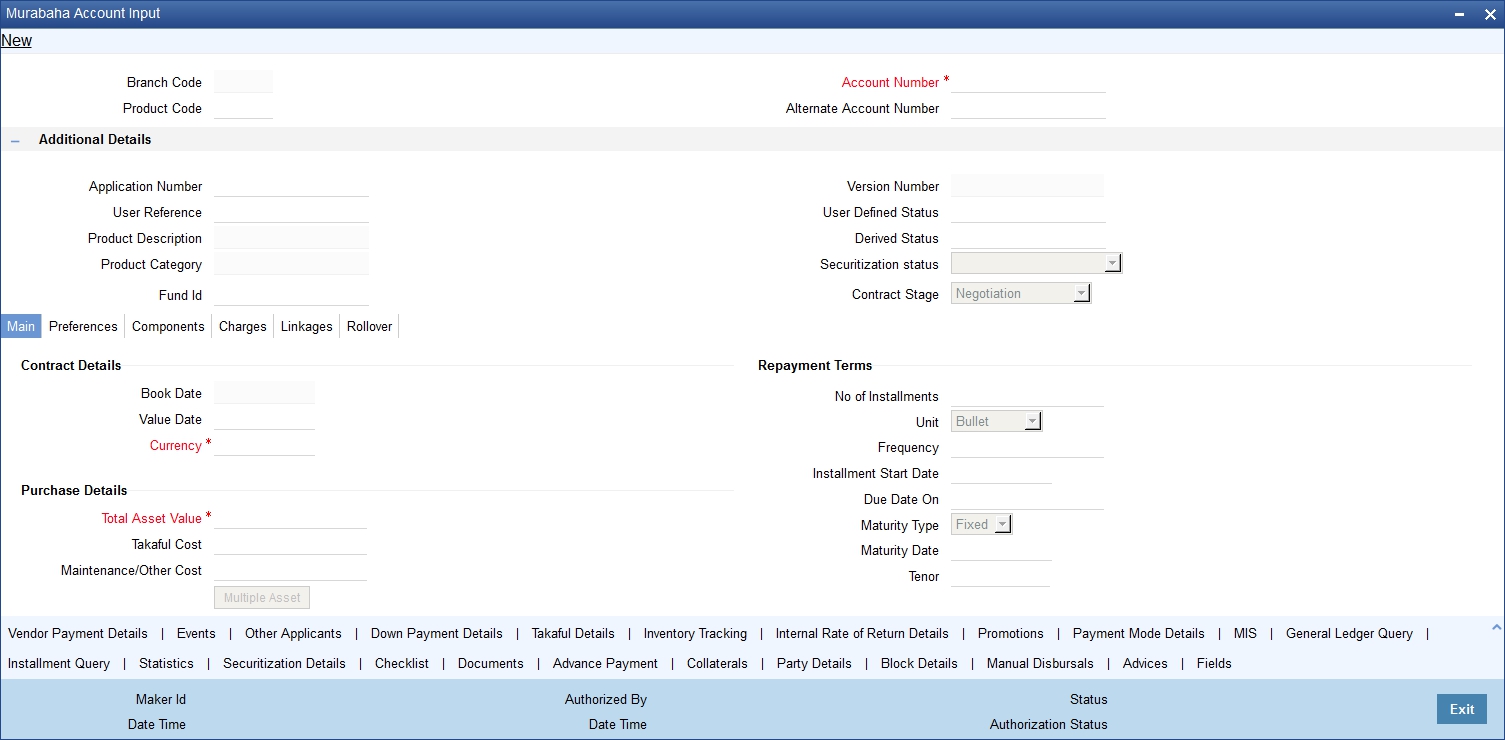 This section contains the details that are specific to Murabaha accounts. For further details and field information, refer to the section ‘Account Main Details/Light Finances’ under chapter ‘Account Creation’ of ‘Islamic Financing’ user manual.