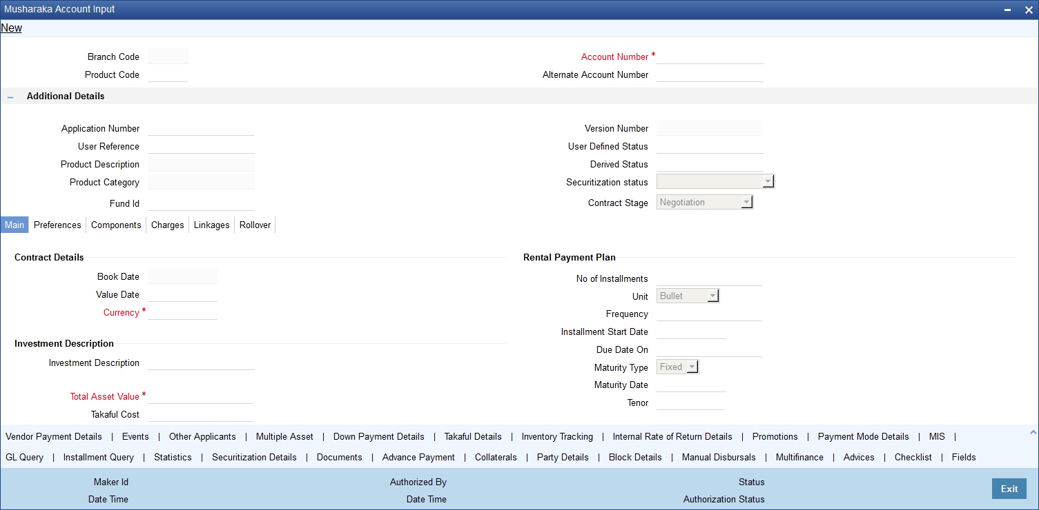 This section contains the details that are specific to Musharaka accounts. For further details and field information, refer to the section ‘Creating Murabaha Accounts’ in this chapter.